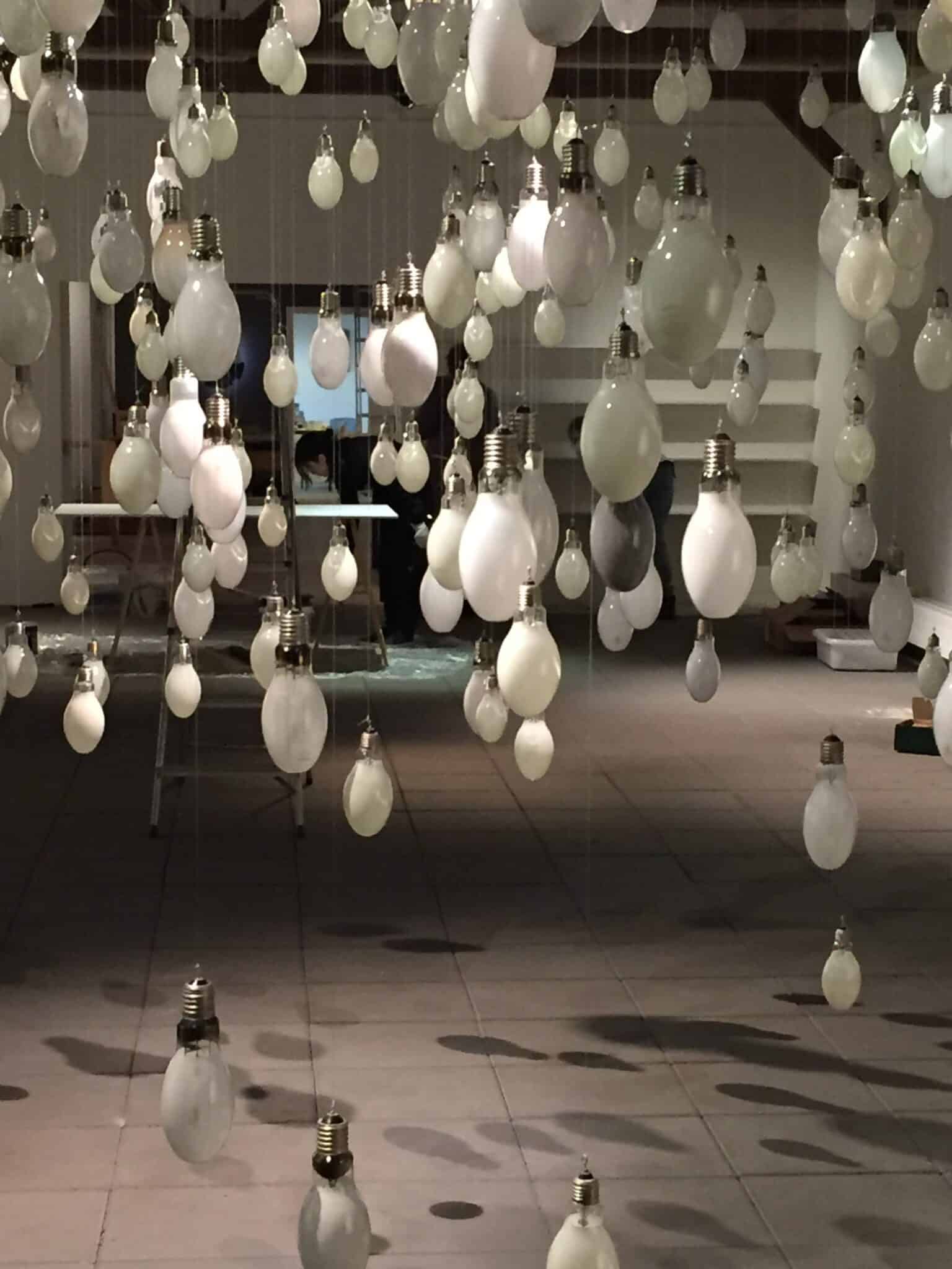 Jeg har valgt at bruge det ubrugelige. Gulvtæpperester der sættes op på væggen og kasserede elpærer, der tidligere har været anvendt til gadebelysning, hænges op som en fritsvævende installation i rummet.